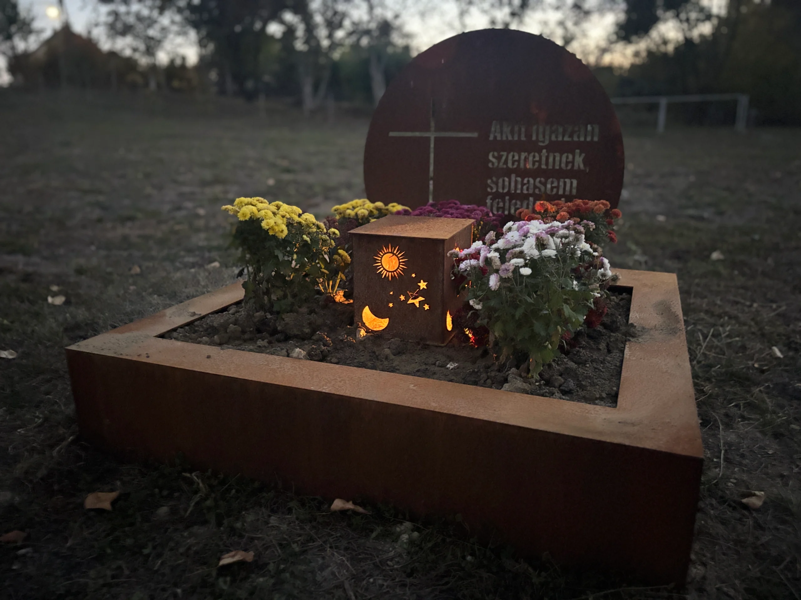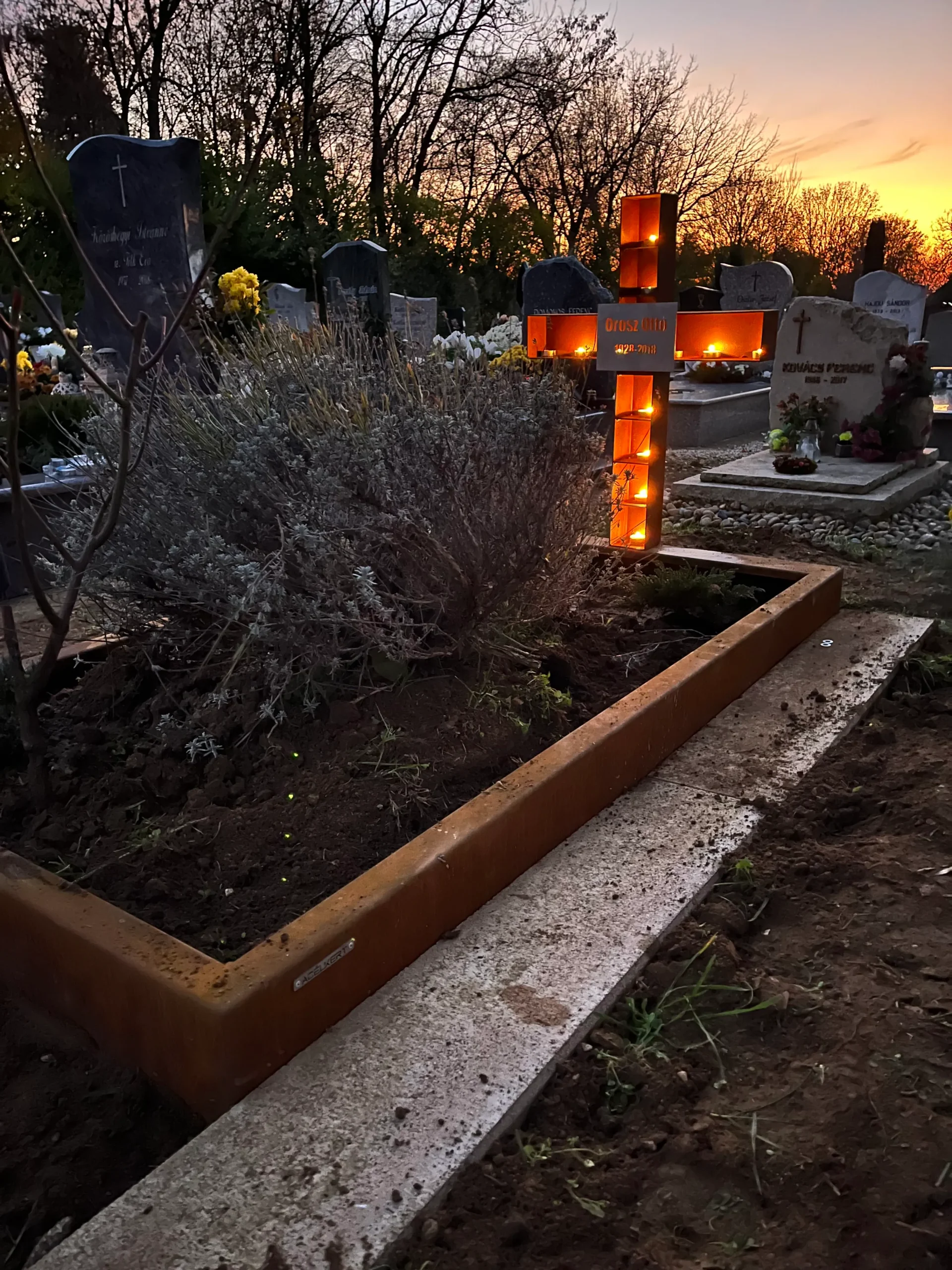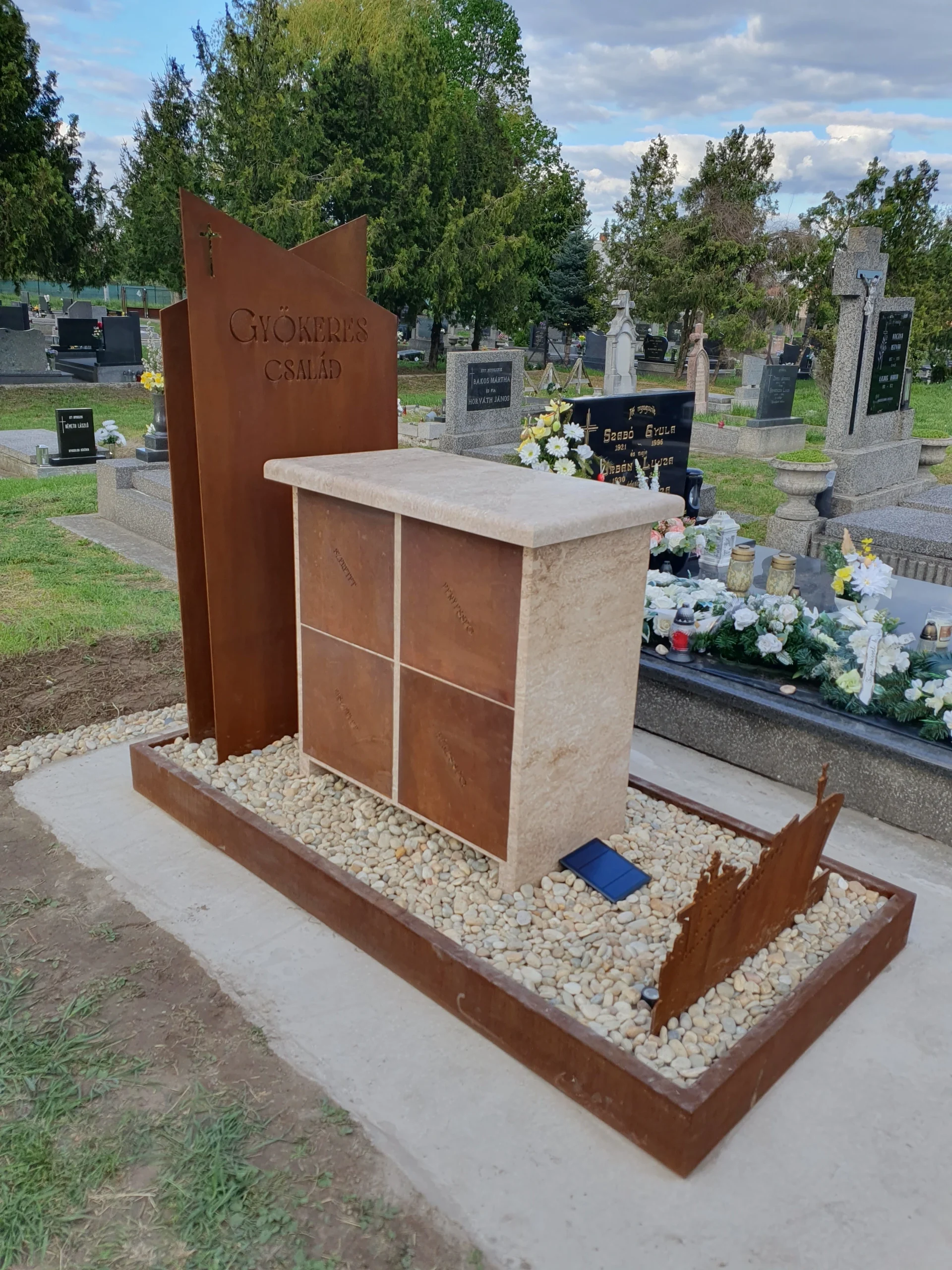 Típus: Fejfa 10 mm, keret: 5 mm, fedlap: 5 mm, kavicstartó: 2 mm-es Cor-ten acélból készült, 2 szett napelemes világítással.