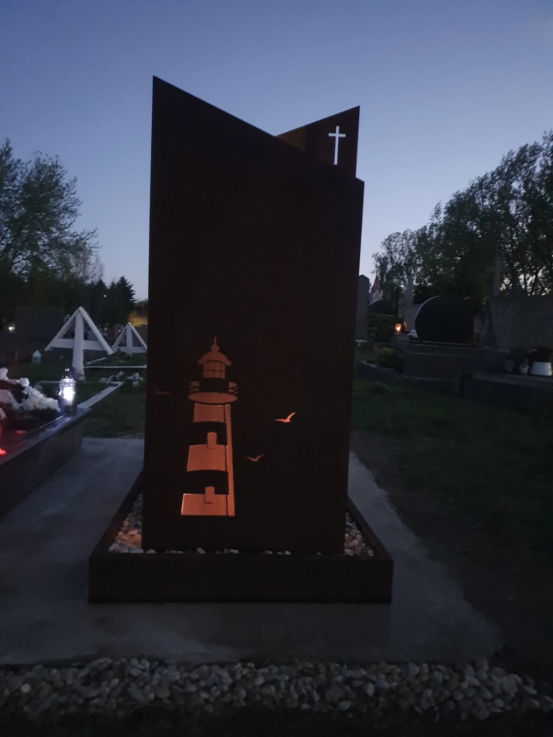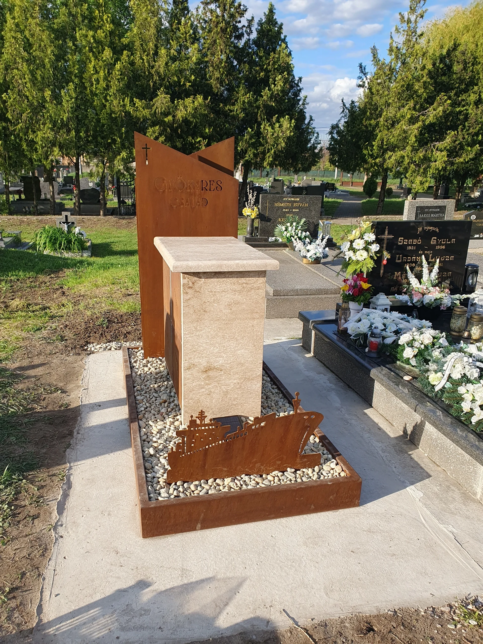 Típus: Fejfa és a hajó 6 mm Cor-ten acél, keret: 2 mm-es Cor-ten acél, urna takarók: 1,5 mm Cor-ten acélból készültek. Napelemes világítással.