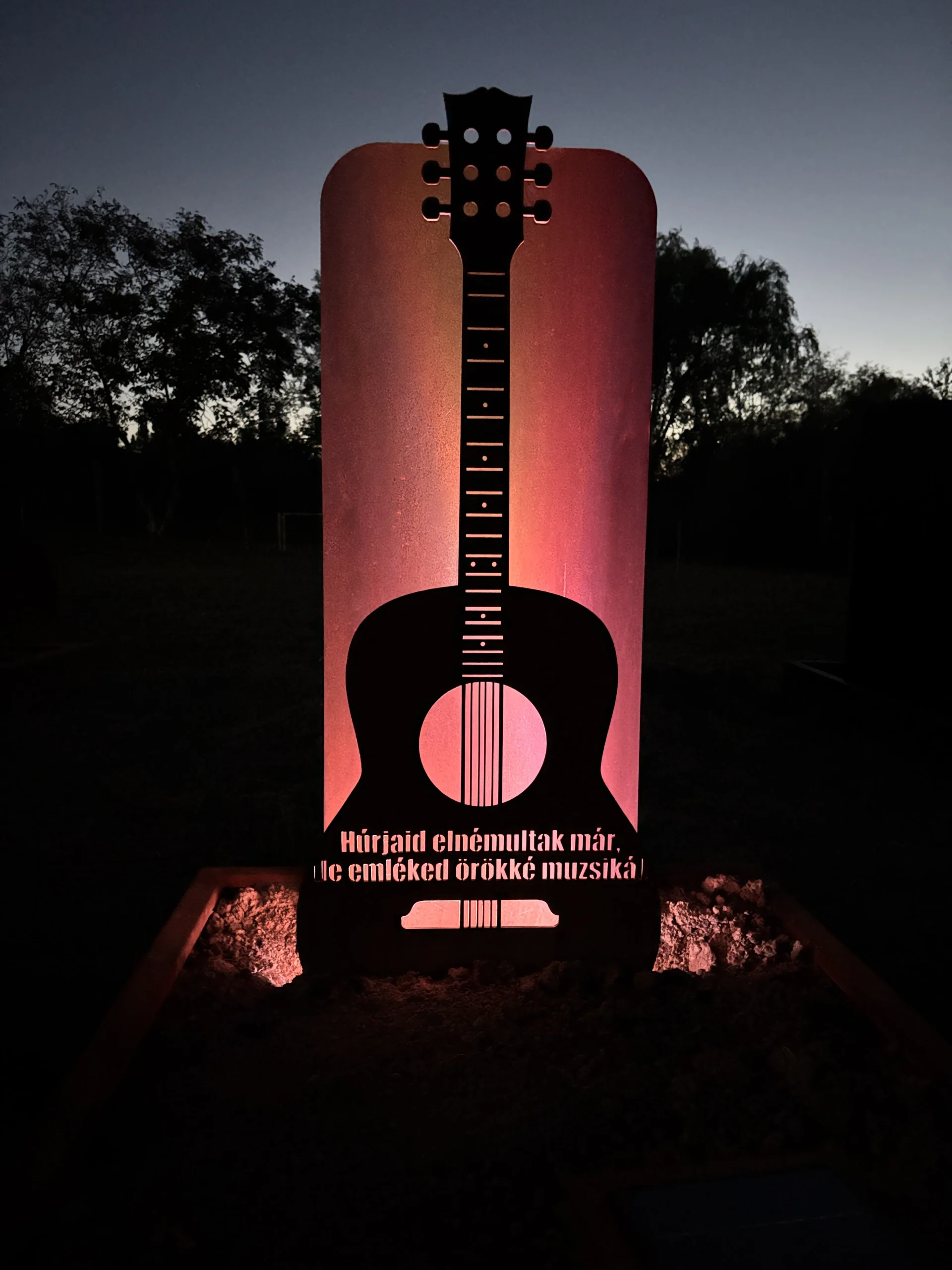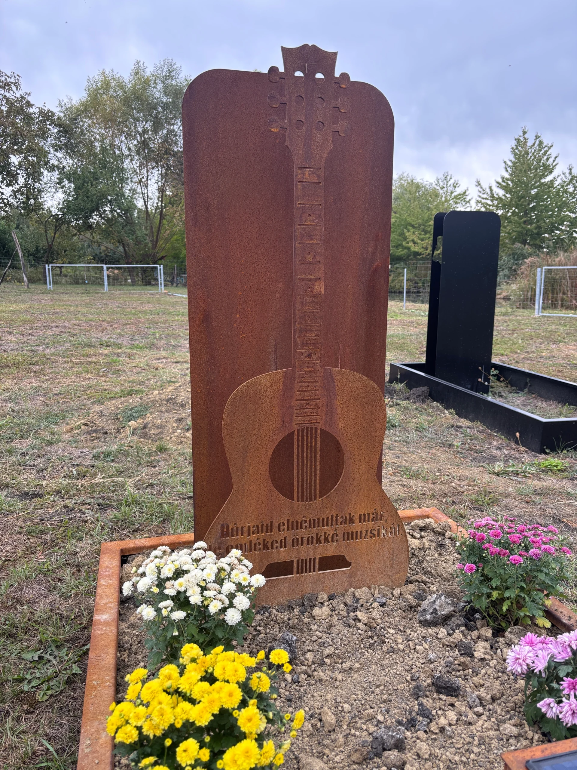 Bemutatókertünk gitár motívumos síremléke – a zene szeretetének méltó emléke.