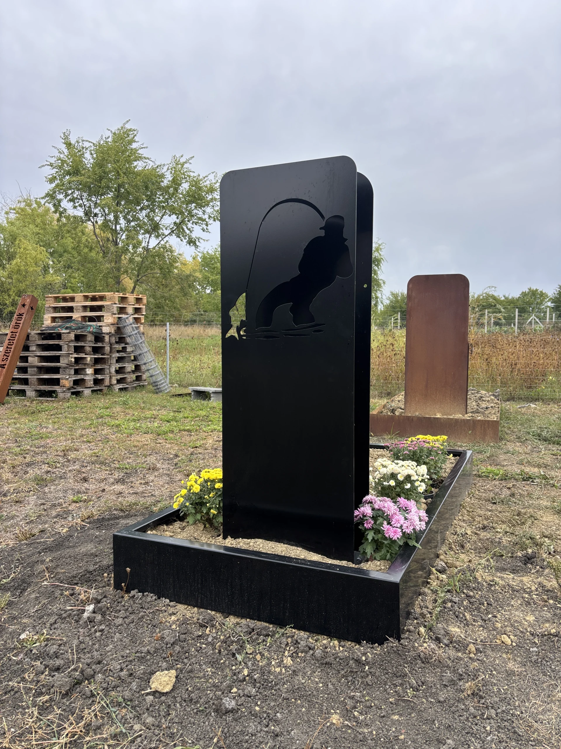 Bemutatókerti mintadarab: kompakt, fektetett fejfa galvanizált és porfestett kivitelben – letisztult, tartós megoldás kisebb sírhelyekhez.