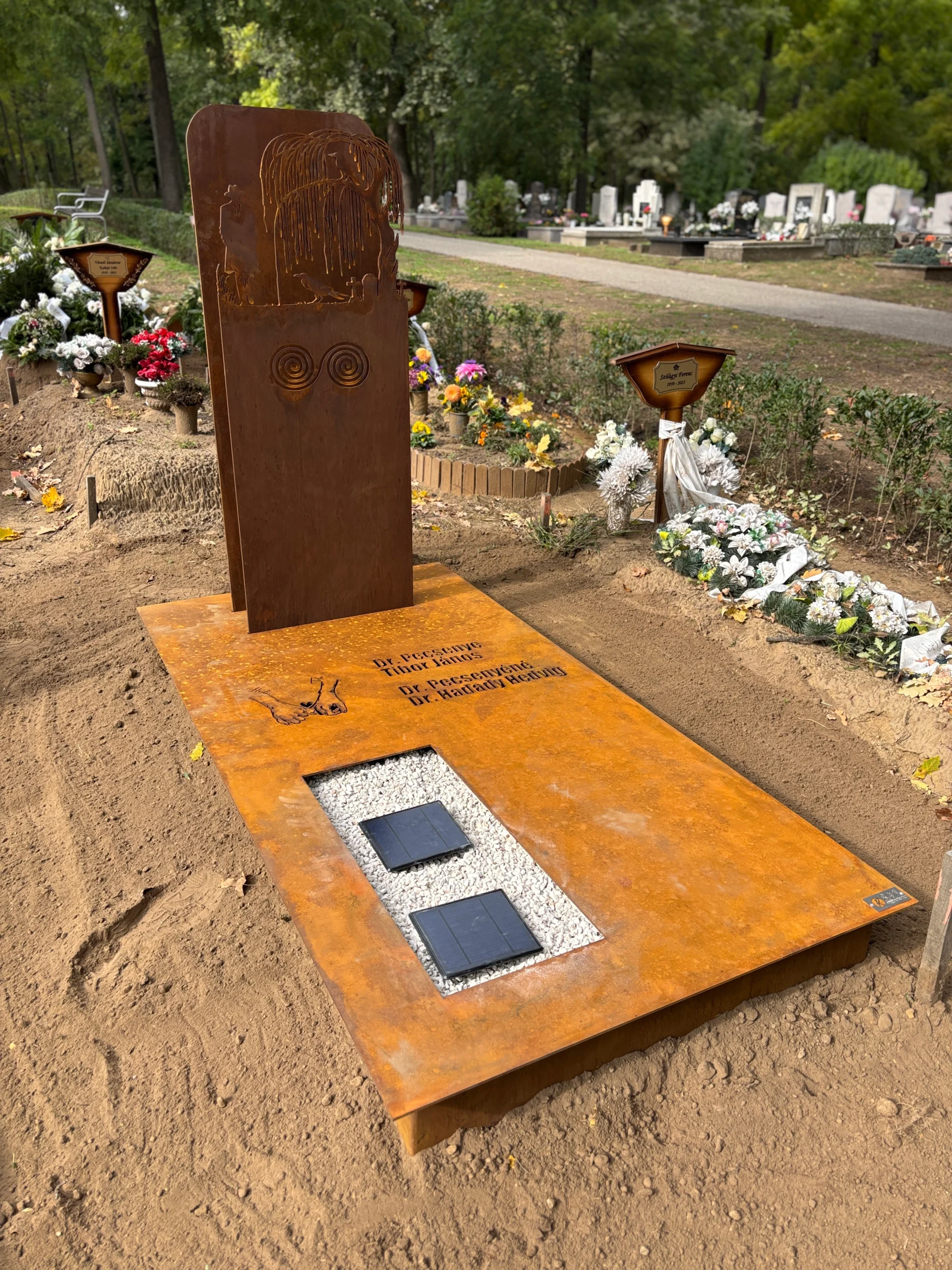 Típus: Fejfa: 8 mm-es, háttérlemez 5 mm-es Cor-ten acél, a keret 4 mm-es corten acélból készült. Napelemes világítással
